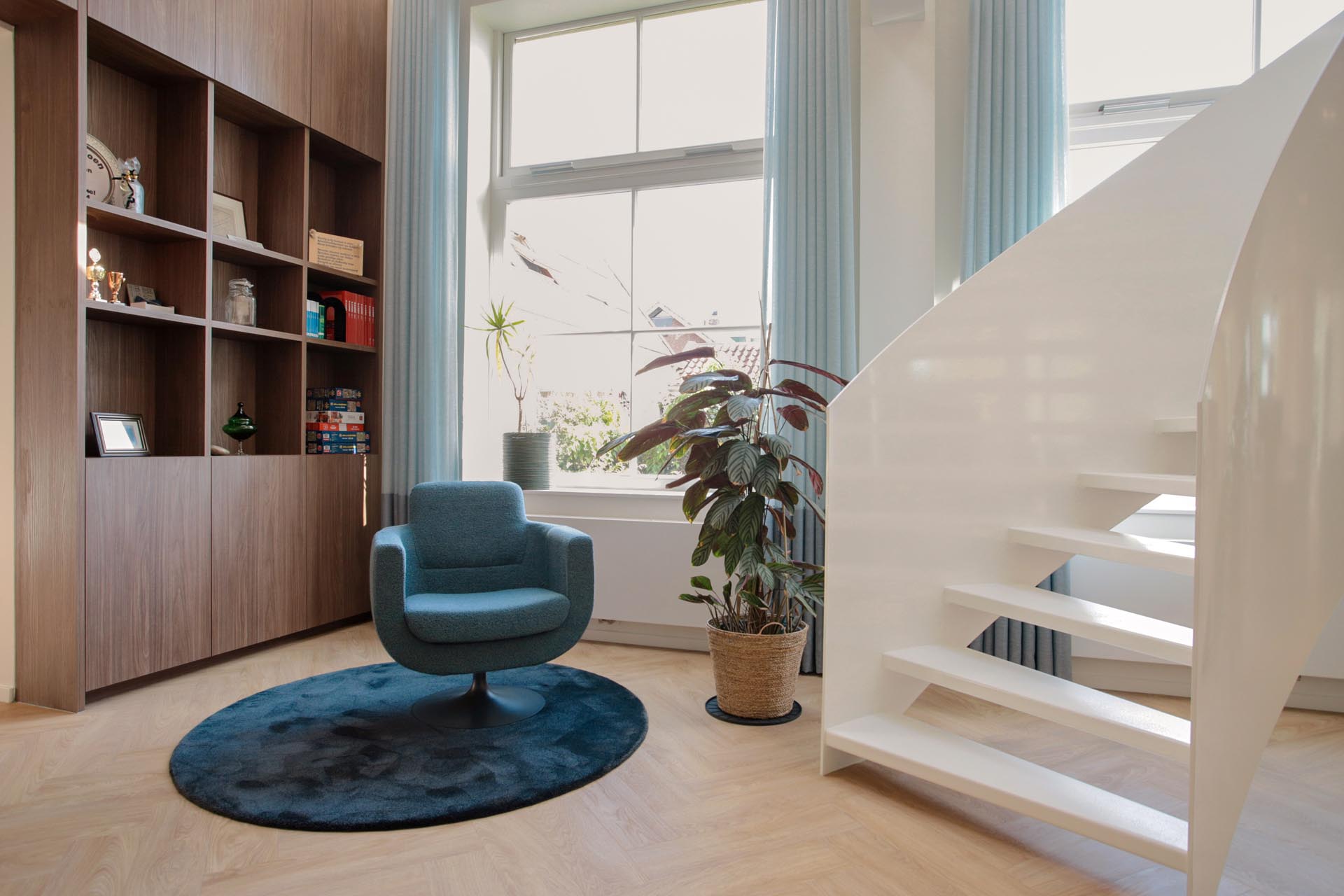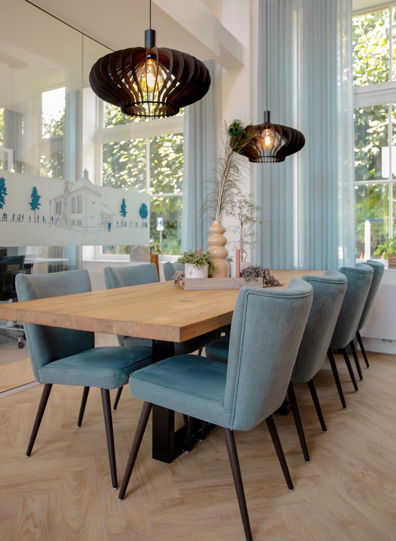 Gezien het blauwe logo van Van Dolder Administratie, is blauw dan ook de basiskleur geworden voor het advies. Echter wel in een zachte variant. Zo hebben de gordijnen 2 kleuren blauw, zijn de stoelen voorzien van een blauwe meubelstof en hebben de kastjes een zacht blauwe ondertoon. Verder heeft de ruimte een witte basis gekregen en zorgen de houten elementen als de vloer, tafels en keuken, voor warmte.
