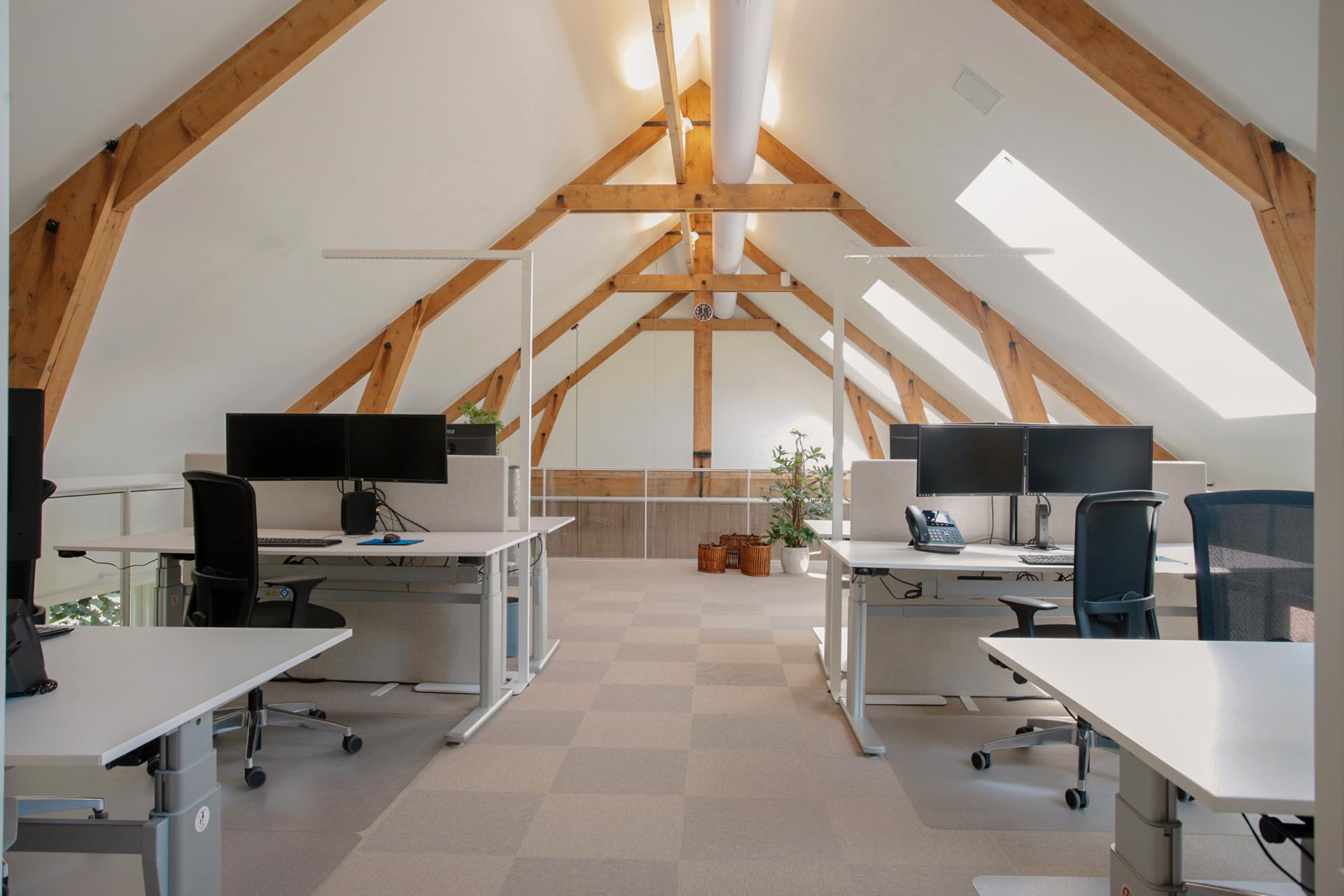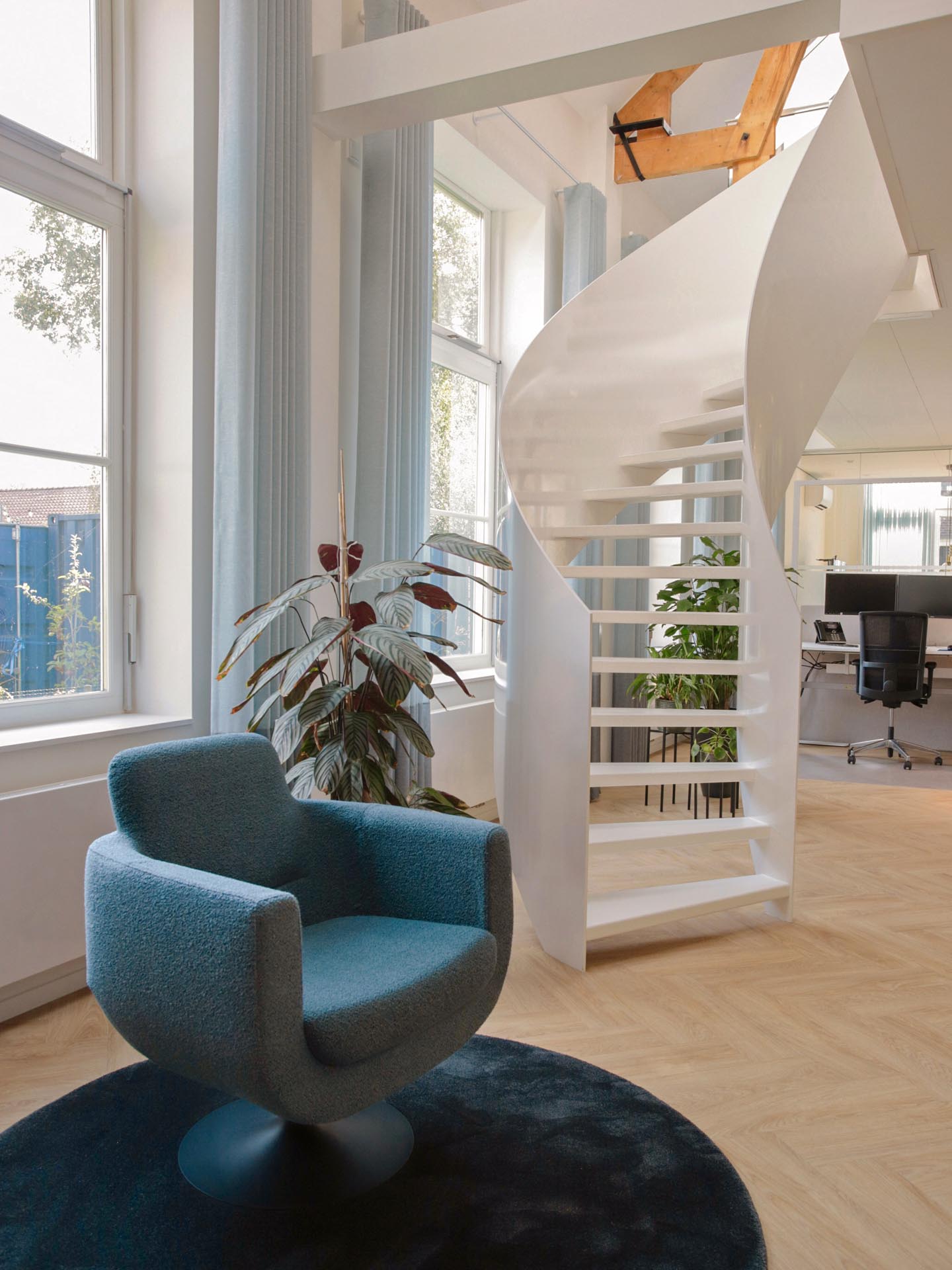 Van Dolder administratie was toe aan een upgrade van het kantoor en dus kwamen ze bij ons voor advies. Na een brainstorm aan ideeën, hebben zij het groots aangepakt en Verwol gevraagd een architect in te schakelen. Zij ontwierpen een zogenaamd ‘zwevend plafond’ waarbij de verdiepingsvloer los staat van de muren en zo lijkt te zweven. Hiermee konden de originele hoge ramen volledig in het zicht blijven en evengoed de ruimte optimaal worden benut. De balken zijn in het zicht gebracht om ook hier de authenticiteit van het pand te benadrukken. Daarnaast is er een moderne wenteltrap geplaatst om zo het oude met het nieuwe te combineren.